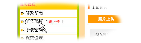 | 注冊(cè)成功后系統(tǒng)會(huì)自動(dòng)跳轉(zhuǎn)到個(gè)人管理頁面,點(diǎn)擊“上傳照片”,上傳不大于100KB的照片,這樣更容易讓招聘企業(yè)青睞; |